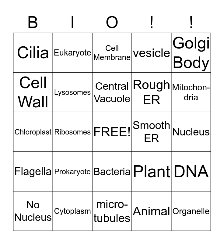 This bingo card has a free space and 24 words: Prokaryote, Cytoplasm, Central Vacuole, No Nucleus, Golgi Body, Cilia, Cell Wall, Eukaryote, Smooth ER, Bacteria, Rough ER, Chloroplast, Plant, DNA, Lysosomes, Animal, Nucleus, Cell Membrane, Mitochon-dria, Ribosomes, Organelle, Flagella, vesicle and micro-tubules.