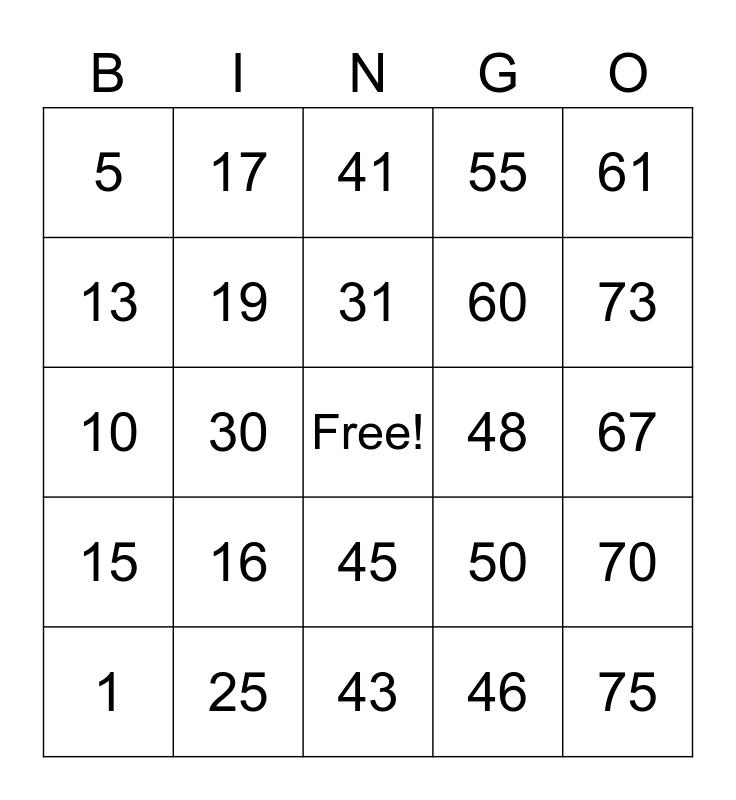This bingo card has a free space and 24 words: 1, 16, 31, 46, 61, 5, 17, 41, 48, 67, 10, 19, 50, 70, 13, 25, 43, 55, 73, 15, 30, 45, 60 and 75.