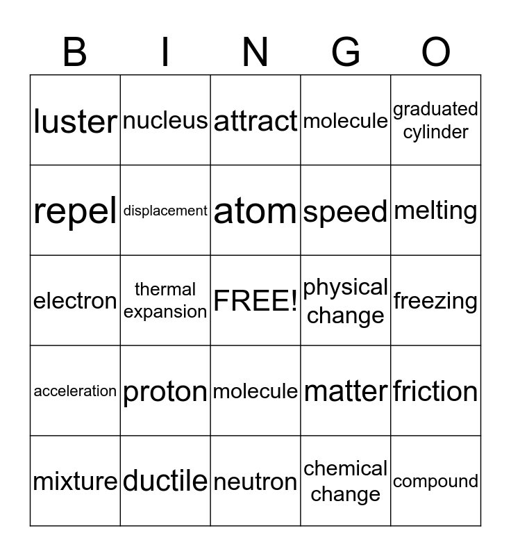 This bingo card has a free space and 24 words: proton, ductile, atom, mixture, graduated cylinder, luster, repel, nucleus, physical change, molecule, speed, electron, matter, friction, displacement, chemical change, freezing, attract, melting, thermal expansion, compound, acceleration, molecule and neutron.