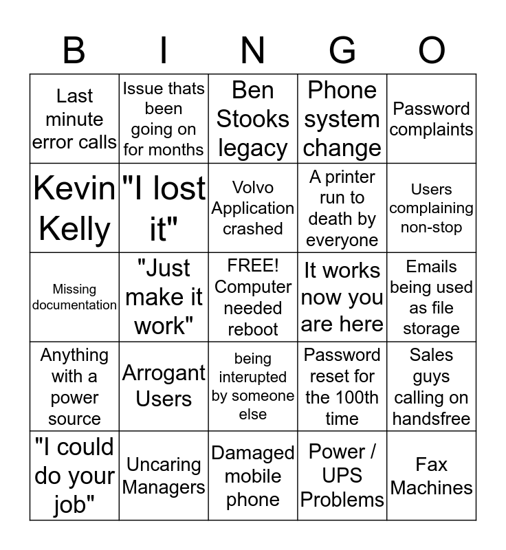 This bingo card has a free space and 24 words: Arrogant Users, Uncaring Managers, Volvo Application crashed, "I could do your job", Password complaints, Last minute error calls, Kevin Kelly, Issue thats been going on for months, It works now you are here, being interupted by someone else, A printer run to death by everyone, Missing documentation, Password reset for the 100th time, Sales guys calling on handsfree, "I lost it", Power / UPS Problems, Emails being used as file storage, Ben Stooks legacy, Users complaining non-stop, "Just make it work", Fax Machines, Anything with a power source, Phone system change and Damaged mobile phone.