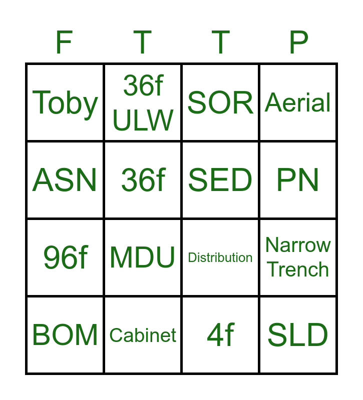 This bingo card has 26 words: Free!, FEx, PN, SN, ASN, Toby, 36f, 36f ULW, 4f, 288f, 96f, Distribution, Core, 110mm, Narrow Trench, PIA, Aerial, SLD, SOR, BOM, MDU, Feeder, Cabinet, Pole, SED and Release Sheet.