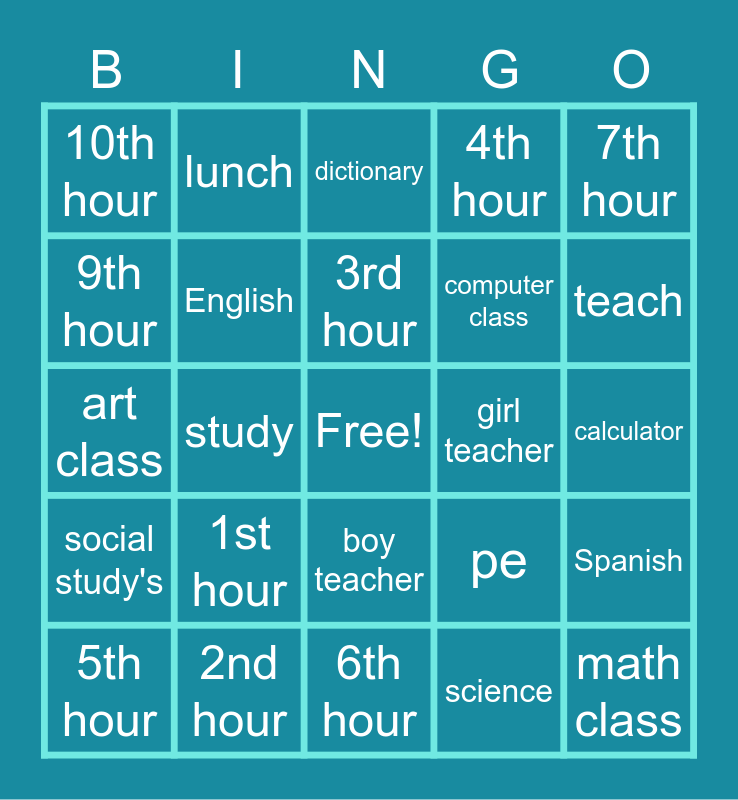 This bingo card has a free space and 24 words: 1st hour, 2nd hour, 3rd hour, 5th hour, 7th hour, 10th hour, 9th hour, lunch, girl teacher, boy teacher, computer class, art class, pe, Spanish, English, science, calculator, dictionary, teach, study, math class, social study's, 4th hour and 6th hour.