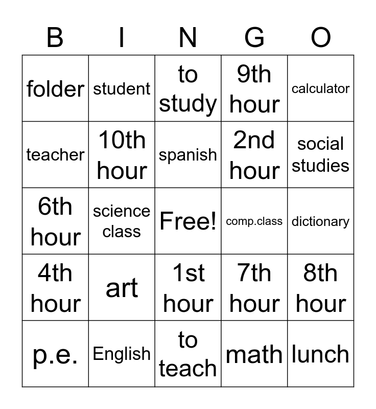 This bingo card has a free space and 24 words: art, English, spanish, p.e., calculator, folder, teacher, student, comp.class, 1st hour, 2nd hour, 6th hour, 7th hour, 8th hour, 10th hour, math, dictionary, to study, social studies, science class, lunch, 4th hour, 9th hour and to teach.