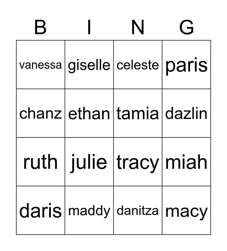 This bingo card has 24 words: polzin, daniel, dazlin, sam, chanz, vanessa, ethan, giselle, maddy, belinda, ruth, tracy, gaby, arianna, tamia, stefany, danitza, celeste, julie, miah, daris, macy, paris and maria.