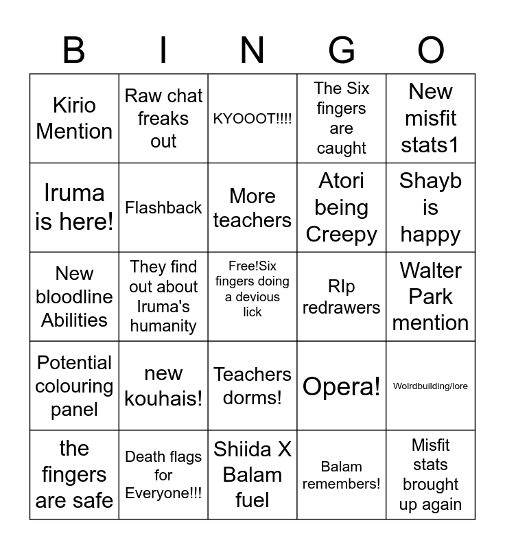 This bingo card has a free space and 27 words: Opera!, Kallego!, Atori being Creepy, Shiida X Balam fuel, Iruma is here!, KYOOOT!!!!, Raw chat freaks out, Potential colouring panel, RIp redrawers, Wolrdbuilding/lore, New bloodline Abilities, The Six fingers are caught, the fingers are safe, Death flags for Everyone!!!, Shayb is happy, Shayb is ANGY, Flashback, More teachers, new kouhais!, Kirio Mention, Walter Park mention, Balam remembers!, They find out about Iruma's humanity, Misfit stats brought up again, Teachers dorms!, New misfit stats1 and Foreshadowing....
