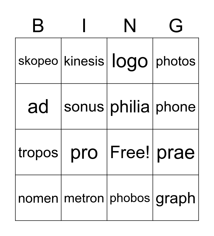 This bingo card has 21 words: metron, syn, kinesis, thesis, phobos, philia, skopeo, logo, Free!, phone, tropos, photos, graph, tele, sonus, video visum, nomen, pro, ad, prae and verbum.