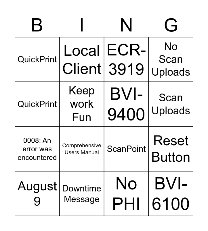 This bingo card has 2 images and 33 words: Free!, ScanPoint, BVI-6400, BVI-6100, BVI-9400, QuickPrint, PHI, Local Client, August 9, Scan Uploads, ECR-3919, 0008: An error was encountered, Keep work Fun, Downtime Message, Comprehensive Users Manual, Reset Button, ScanPoint, Verathon, BVI-6400, BVI-6100, BVI-9400, QuickPrint, No PHI, Local Client, August 9, No Scan Uploads, ECR-3919, 0008: An error was encountered, Keep work Fun, Downtime Message, Reset Button, Comprehensive Users Manual and Continuous Improvement.