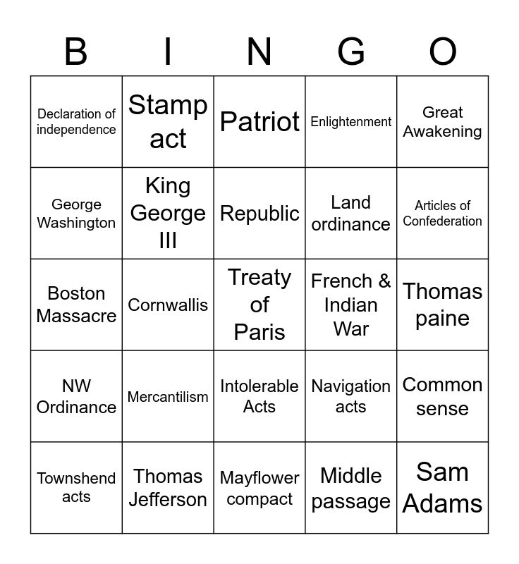 This bingo card has a free space and 24 words: Mercantilism, Thomas Jefferson, Republic, Townshend acts, Great Awakening, Declaration of independence, George Washington, Stamp act, French & Indian War, Intolerable Acts, Land ordinance, Boston Massacre, Navigation acts, Common sense, King George III, Middle passage, Thomas paine, Patriot, Articles of Confederation, Cornwallis, Sam Adams, NW Ordinance, Enlightenment and Mayflower compact.
