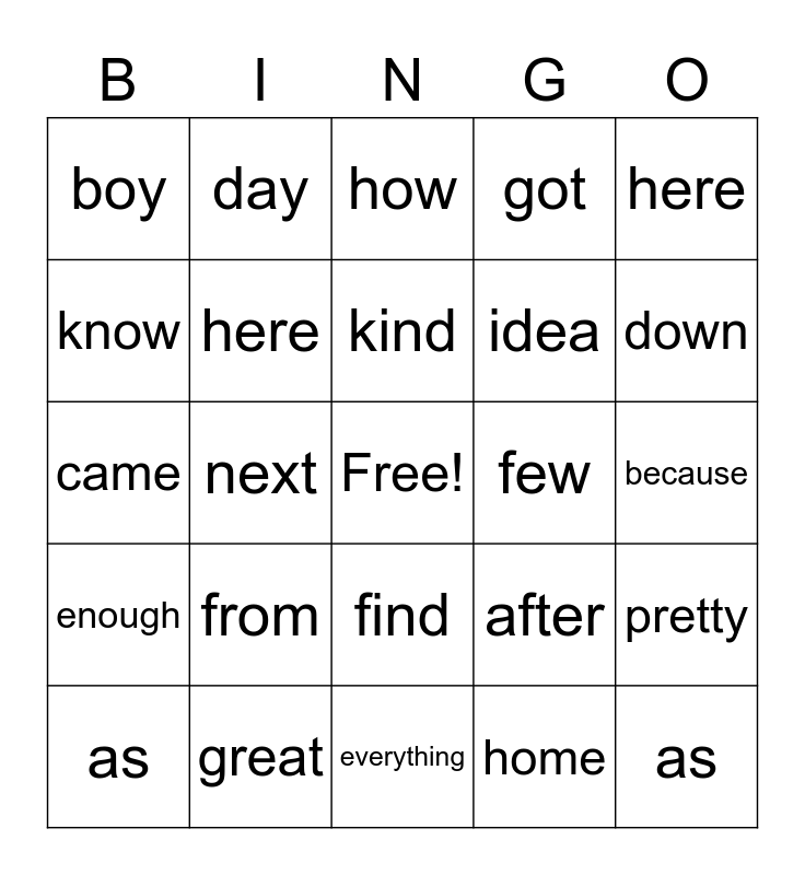 This bingo card has a free space and 44 words: as, as, as, as, as, home, how, her, here, great, got, few, find, from, enough, everything, each, came, could, down, day, back, been, boy, by, because, away, always, after, enough, great, pretty, often, never, next, might, myself, little, kind, know, idea, just, here and have.