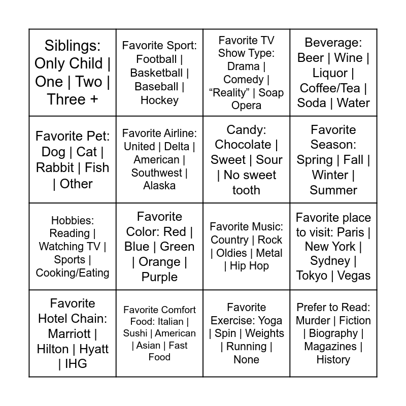 This bingo card has 16 words: Favorite Comfort Food: Italian | Sushi | American | Asian | Fast Food, Favorite place to visit: Paris | New York | Sydney | Tokyo | Vegas, Favorite TV Show Type: Drama | Comedy | “Reality” | Soap Opera, Siblings: Only Child | One | Two | Three +, Hobbies: Reading | Watching TV | Sports | Cooking/Eating, Favorite Sport: Football | Basketball | Baseball | Hockey, Favorite Music: Country | Rock | Oldies | Metal | Hip Hop, Favorite Exercise: Yoga | Spin | Weights | Running | None, Favorite Pet: Dog | Cat | Rabbit | Fish | Other, Favorite Airline: United | Delta | American | Southwest | Alaska, Favorite Hotel Chain: Marriott | Hilton | Hyatt | IHG, Beverage: Beer | Wine | Liquor | Coffee/Tea | Soda | Water, Favorite Color: Red | Blue | Green | Orange | Purple, Favorite Season: Spring | Fall | Winter | Summer, Candy: Chocolate | Sweet | Sour | No sweet tooth and Prefer to Read: Murder | Fiction | Biography | Magazines | History.
