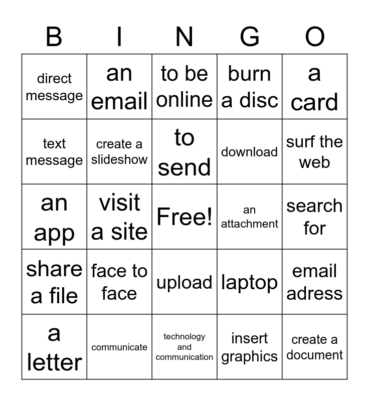 This bingo card has a free space and 24 words: face to face, communicate, to send, a letter, a card, direct message, text message, an email, an attachment, upload, download, an app, laptop, email adress, create a slideshow, insert graphics, search for, to be online, surf the web, visit a site, create a document, share a file, burn a disc and technology and communication.