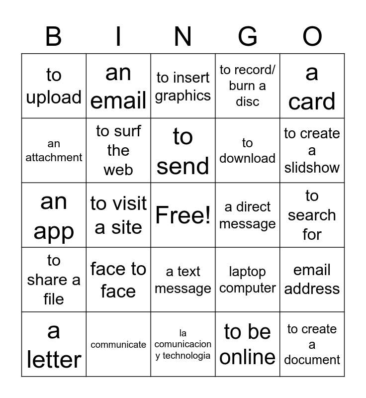 This bingo card has a free space and 24 words: face to face, communicate, to send, a letter, a card, to upload, an attachment, an email, a direct message, a text message, to download, an app, laptop computer, email address, to surf the web, to be online, to search for, to insert graphics, to create a slidshow, to visit a site, to create a document, to share a file, to record/ burn a disc and la comunicacion y technologia.
