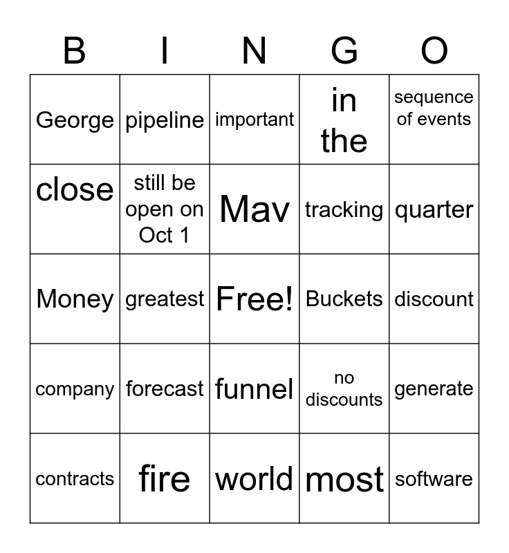 This bingo card has a free space and 24 words: forecast, fire, Mav, contracts, sequence of events, George, close, pipeline, Buckets, funnel, tracking, Money, no discounts, generate, still be open on Oct 1, most, discount, important, quarter, greatest, software, company, in the and world.
