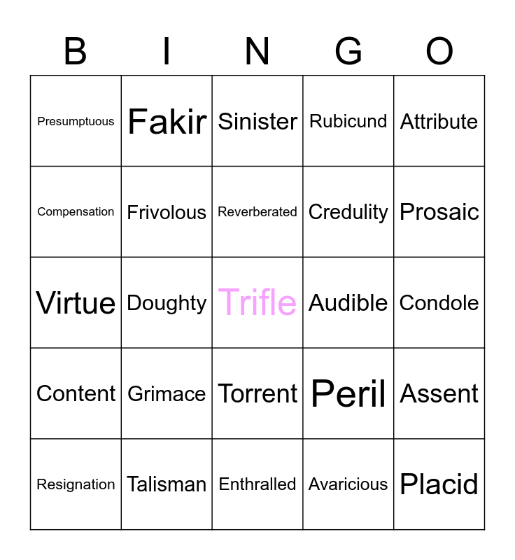 This bingo card has a free space and 24 words: Grimace, Talisman, Reverberated, Resignation, Attribute, Presumptuous, Compensation, Fakir, Audible, Torrent, Credulity, Virtue, Peril, Assent, Frivolous, Avaricious, Condole, Sinister, Prosaic, Doughty, Placid, Content, Rubicund and Enthralled.