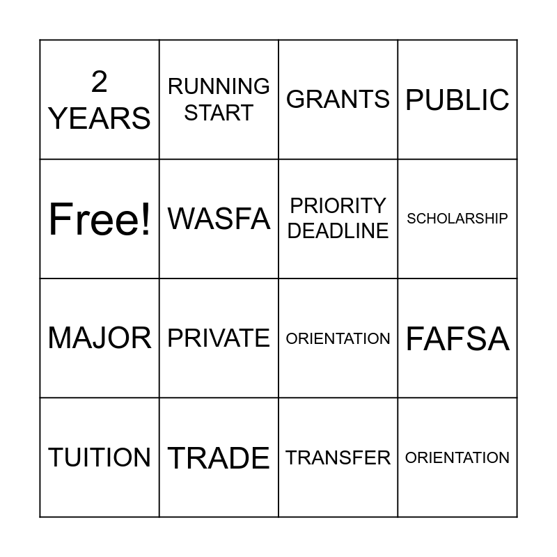 This bingo card has 16 words: TRADE, FAFSA, GRANTS, 2 YEARS, MAJOR, RUNNING START, ORIENTATION, TRANSFER, Free!, WASFA, TUITION, PUBLIC, PRIVATE, SCHOLARSHIP, PRIORITY DEADLINE and ORIENTATION.