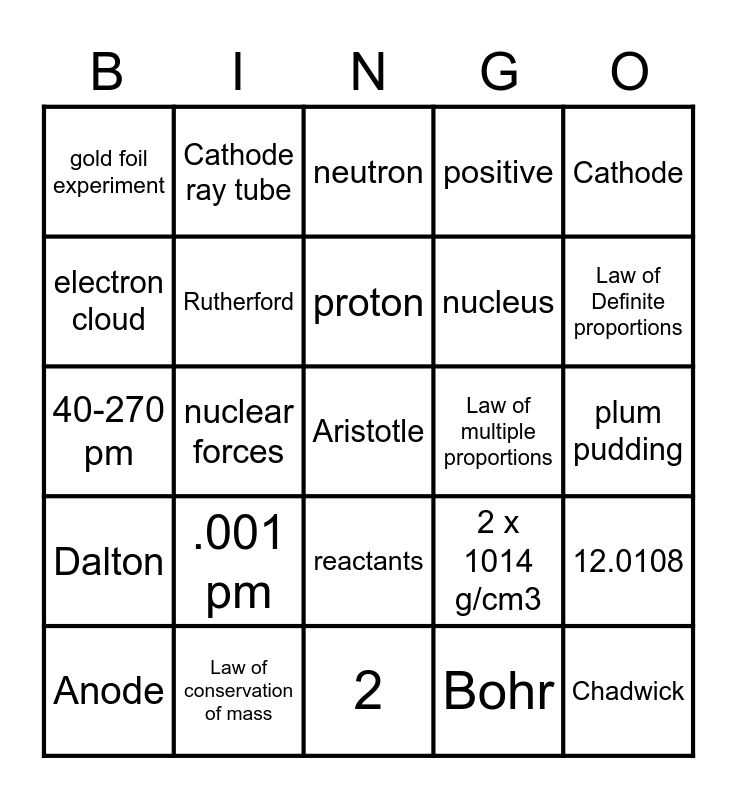 This bingo card has 34 words: Chadwick, Bohr, Democritus, Thomson, Dalton, Rutherford, Cathode, Anode, Cathode ray tube, electron, proton, neutron, CH3CO2H, chemical reaction, Law of multiple proportions, Law of Definite proportions, Law of conservation of mass, 40-270 pm, .001 pm, 2 x 1014 g/cm3, reactants, products, gold foil experiment, plum pudding, 2, Aristotle, positive, negative, nucleus, electron cloud, atom, nuclear forces, 12.0108 and neutral.