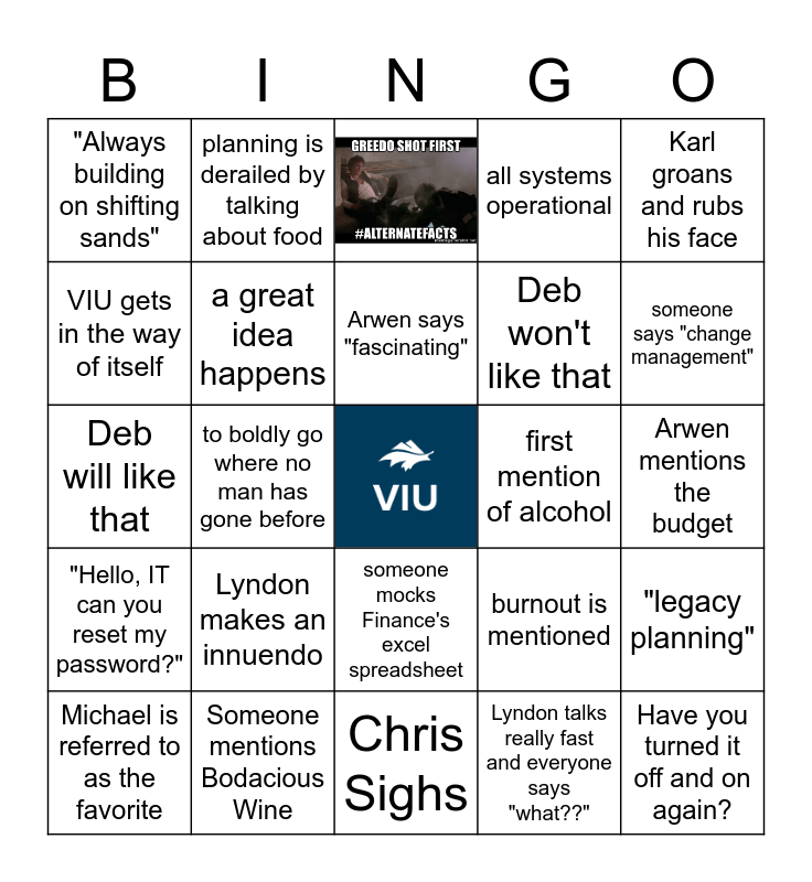 This bingo card has 1 images, a free space and 23 words: Lyndon makes an innuendo, Someone mentions Bodacious Wine, Arwen says "fascinating", Michael is referred to as the favorite, Karl groans and rubs his face, "Always building on shifting sands", VIU gets in the way of itself, planning is derailed by talking about food, first mention of alcohol, someone mocks Finance's excel spreadsheet, Deb won't like that, Deb will like that, burnout is mentioned, "legacy planning", a great idea happens, Lyndon talks really fast and everyone says "what??", Arwen mentions the budget, someone says "change management", to boldly go where no man has gone before, Have you turned it off and on again?, "Hello, IT can you reset my password?", all systems operational and Chris Sighs.