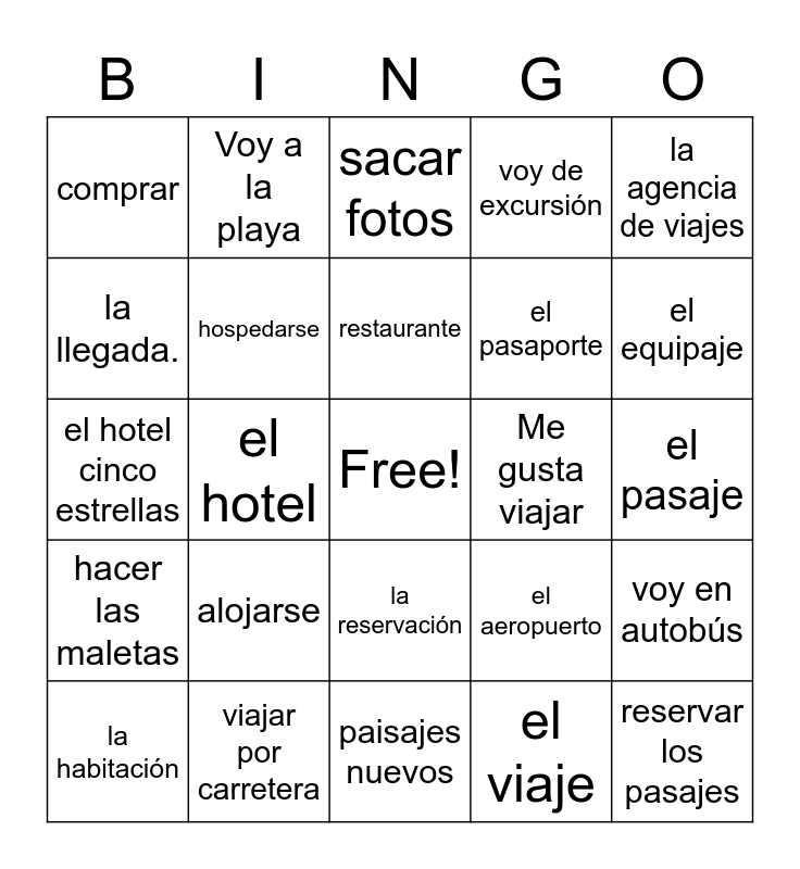 This bingo card has a free space and 29 words: la habitación, Hacer turismo, el hotel, relajarse, comprar, sacar fotos, hospedarse, alojarse, Me gusta viajar, viajar por carretera, el pasaje, reservar los pasajes, paisajes nuevos, el viaje, el equipaje, viaje por avión, la reservación, hacer las maletas, la agencia de viajes, el hotel cinco estrellas, el aeropuerto, el extranjero, el pasaporte, la llegada., voy de excursión, Voy a la playa, voy en autobús, restaurante and senderismo.