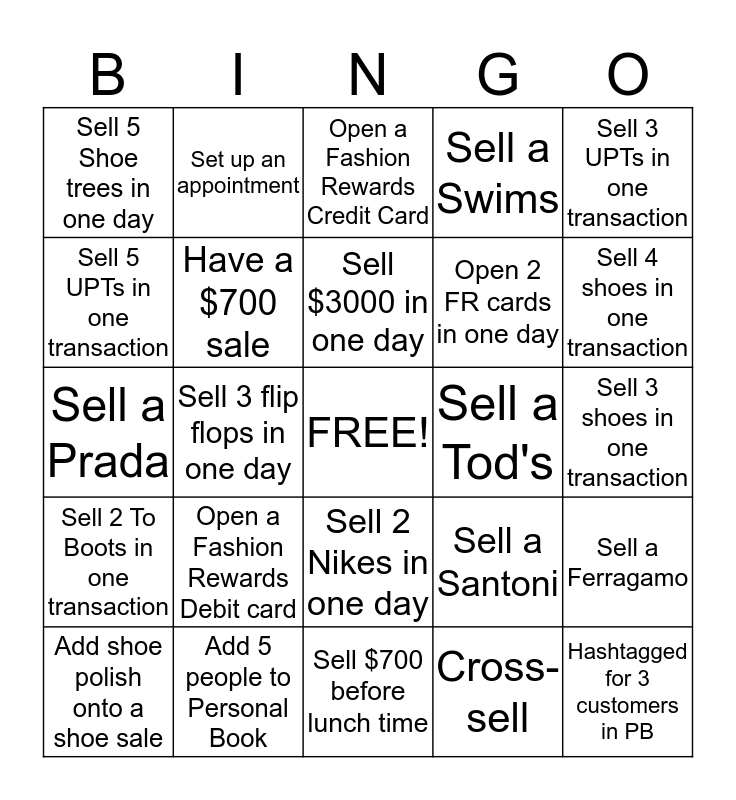 This bingo card has a free space and 24 words: Open a Fashion Rewards Debit card, Add 5 people to Personal Book, Sell $3000 in one day, Add shoe polish onto a shoe sale, Sell 3 UPTs in one transaction, Sell 5 Shoe trees in one day, Sell 5 UPTs in one transaction, Set up an appointment, Sell a Tod's, Sell 2 Nikes in one day, Open 2 FR cards in one day, Sell a Prada, Sell a Santoni, Sell a Ferragamo, Have a $700 sale, Cross-sell, Sell 3 shoes in one transaction, Open a Fashion Rewards Credit Card, Sell 4 shoes in one transaction, Sell 3 flip flops in one day, Hashtagged for 3 customers in PB, Sell 2 To Boots in one transaction, Sell a Swims and Sell $700 before lunch time.