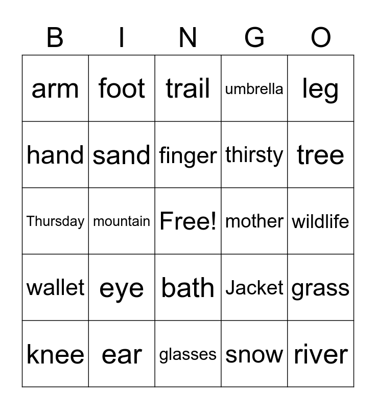 This bingo card has a free space and 24 words: eye, ear, finger, knee, leg, arm, hand, foot, mother, bath, thirsty, Thursday, Jacket, grass, sand, snow, wildlife, trail, tree, mountain, river, wallet, umbrella and glasses.