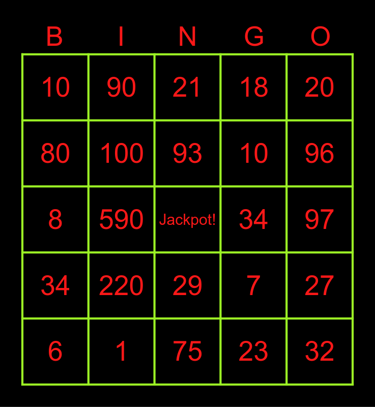 This bingo card has a free space and 29 words: 6, 45, 590, 91, 10, 21, 100, 220, 34, 1, 97, 32, 75, 23, 96, 89, 29, 34, 20, 8, 7, 29, 10, 80, 18, 90, 27, 93 and 80.