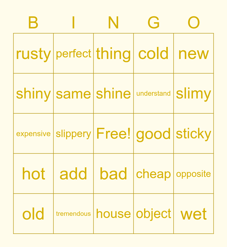 This bingo card has a free space and 24 words: add, tremendous, shine, old, new, rusty, shiny, perfect, good, bad, understand, expensive, cheap, opposite, same, object, sticky, thing, slimy, slippery, wet, hot, cold and house.