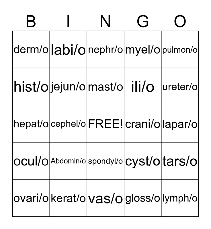This bingo card has a free space and 24 words: Abdomin/o, kerat/o, mast/o, ovari/o, pulmon/o, derm/o, hist/o, labi/o, crani/o, spondyl/o, ili/o, hepat/o, cyst/o, tars/o, jejun/o, gloss/o, lapar/o, nephr/o, ureter/o, cephel/o, lymph/o, ocul/o, myel/o and vas/o.