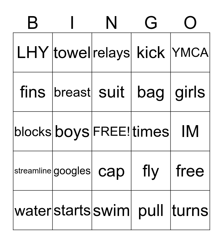 This bingo card has a free space and 25 words: googles, swim, suit, water, YMCA, LHY, fins, towel, times, cap, bag, blocks, fly, free, breast, back, IM, relays, girls, boys, turns, starts, streamline, kick and pull.