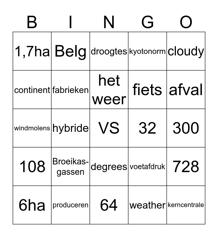 This bingo card has 25 words: Broeikas-gassen, 64, het weer, 6ha, cloudy, 1,7ha, continent, Belg, 32, degrees, fiets, windmolens, voetafdruk, 728, fabrieken, kerncentrale, 300, droogtes, afval, hybride, VS, produceren, 108, kyotonorm and weather.
