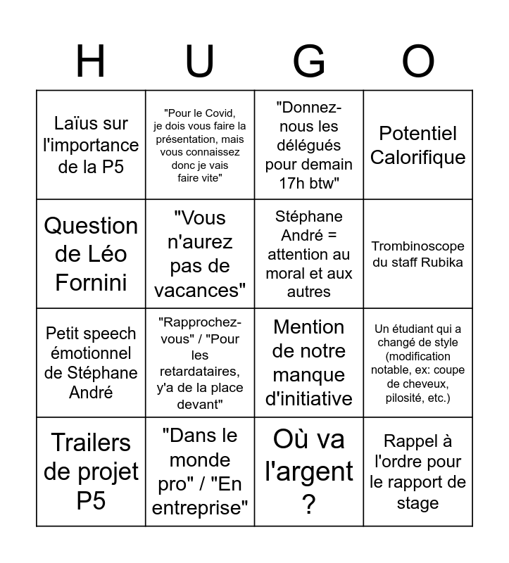 This bingo card has 16 words: "Dans le monde pro" / "En entreprise", Un étudiant qui a changé de style (modification notable, ex: coupe de cheveux, pilosité, etc.), "Donnez-nous les délégués pour demain 17h btw", Laïus sur l'importance de la P5, Petit speech émotionnel de Stéphane André, "Pour le Covid, je dois vous faire la présentation, mais vous connaissez donc je vais faire vite", Mention de notre manque d'initiative, Où va l'argent ?, Question de Léo Fornini, "Vous n'aurez pas de vacances", Trailers de projet P5, Potentiel Calorifique, "Rapprochez-vous" / "Pour les retardataires, y'a de la place devant", Trombinoscope du staff Rubika, Stéphane André = attention au moral et aux autres and Rappel à l'ordre pour le rapport de stage.