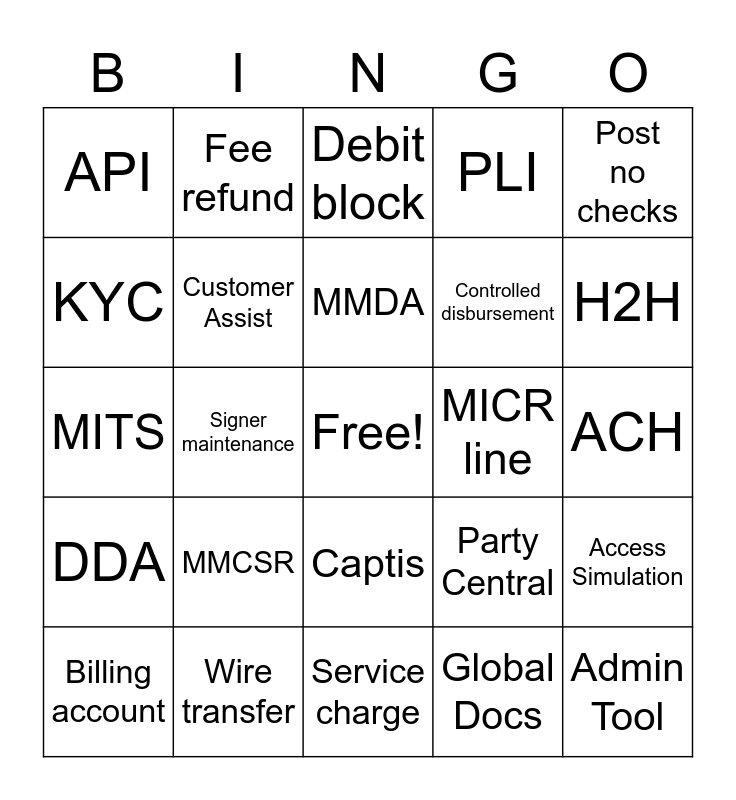 This bingo card has a free space and 36 words: Chase Connect, JPMorgan Access, Navigator, Customer Assist, Party Central, DDA, MMDA, Checks, Post no checks, P & P, Signer maintenance, PLI, Spec, MICR line, H2H, API, Remit Admin, MMCSR, Admin Tool, Debit block, ACH, Access Simulation, Wire transfer, Billing account, Service charge, Fee refund, MITS, CD, Controlled disbursement, KYC, Banker, TMO, Global Docs, Captis, Signature card and Core Signer Authorization.
