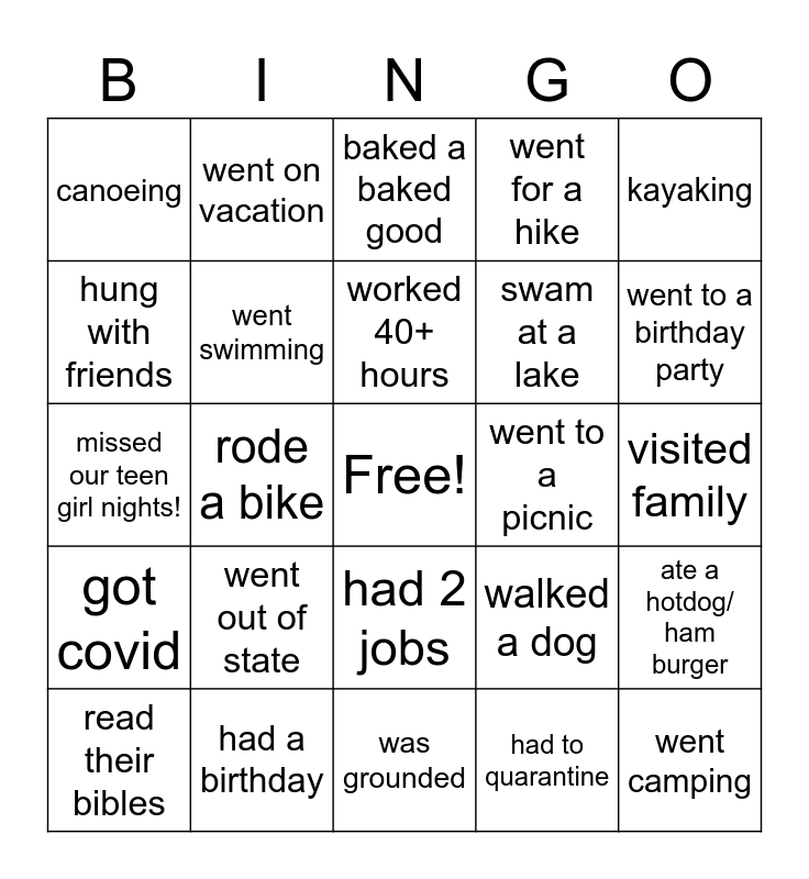 This bingo card has a free space and 24 words: read their bibles, went out of state, worked 40+ hours, had to quarantine, kayaking, canoeing, went on vacation, baked a baked good, went to a picnic, visited family, missed our teen girl nights!, went swimming, walked a dog, ate a hotdog/ ham burger, hung with friends, had a birthday, was grounded, went for a hike, went to a birthday party, got covid, rode a bike, had 2 jobs, swam at a lake and went camping.