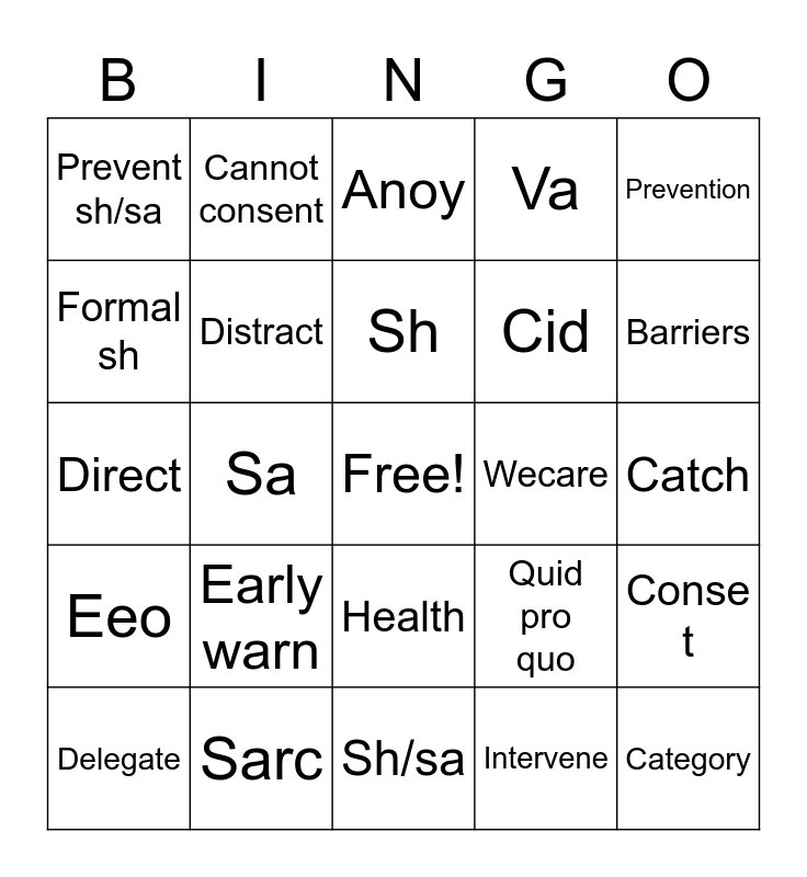 This bingo card has a free space and 24 words: Delegate, Early warn, Sh, Intervene, Prevention, Prevent sh/sa, Cannot consent, Anoy, Wecare, Catch, Direct, Distract, Quid pro quo, Conse t, Formal sh, Sarc, Sh/sa, Va, Barriers, Eeo, Sa, Health, Cid and Category.