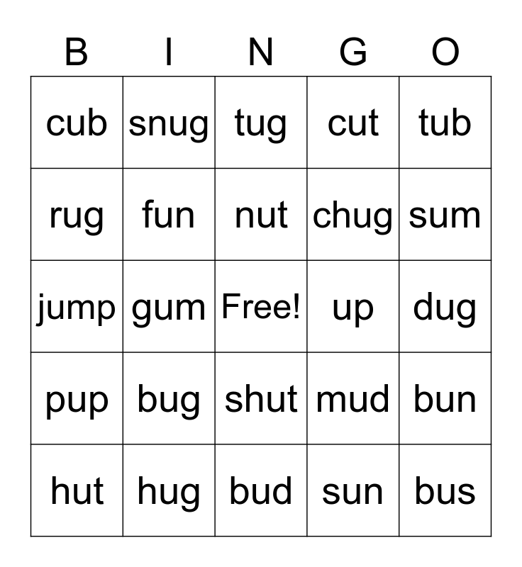 This bingo card has a free space and 24 words: bug, hug, nut, hut, tub, cub, rug, snug, up, shut, chug, jump, mud, bun, fun, sun, dug, tug, sum, gum, bus, pup, cut and bud.