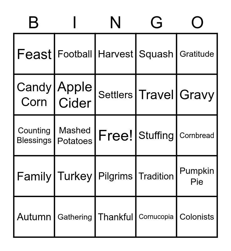 This bingo card has a free space and 24 words: Turkey, Gathering, Settlers, Autumn, Gratitude, Feast, Candy Corn, Football, Stuffing, Pilgrims, Travel, Counting Blessings, Tradition, Pumpkin Pie, Apple Cider, Cornucopia, Cornbread, Harvest, Gravy, Mashed Potatoes, Colonists, Family, Squash and Thankful.