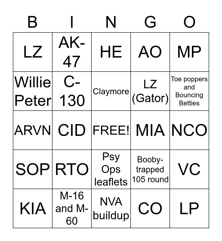 This bingo card has a free space and 24 words: RTO, M-16 and M-60, Claymore, KIA, MP, LZ, Willie Peter, AK-47, MIA, Psy Ops leaflets, LZ (Gator), ARVN, Booby-trapped 105 round, VC, C-130, CO, NCO, HE, Toe poppers and Bouncing Betties, CID, LP, SOP, AO and NVA buildup.