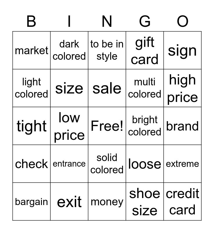 This bingo card has a free space and 24 words: entrance, exit, sale, bargain, sign, market, light colored, dark colored, bright colored, solid colored, multi colored, tight, loose, extreme, size, shoe size, brand, to be in style, high price, low price, credit card, check, gift card and money.