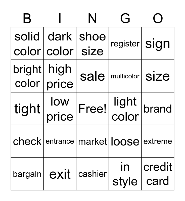 This bingo card has a free space and 24 words: entrance, exit, sale, bargain, sign, solid color, bright color, dark color, light color, market, multicolor, tight, loose, extreme, high price, in style, brand, shoe size, size, low price, credit card, check, register and cashier.