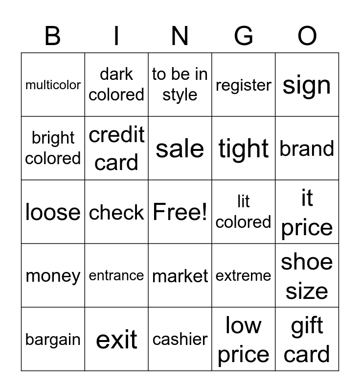 This bingo card has a free space and 24 words: entrance, exit, sale, bargain, sign, multicolor, bright colored, dark colored, lit colored, market, tight, loose, extreme, shoe size, credit card, low price, it price, to be in style, brand, check, gift card, money, register and cashier.