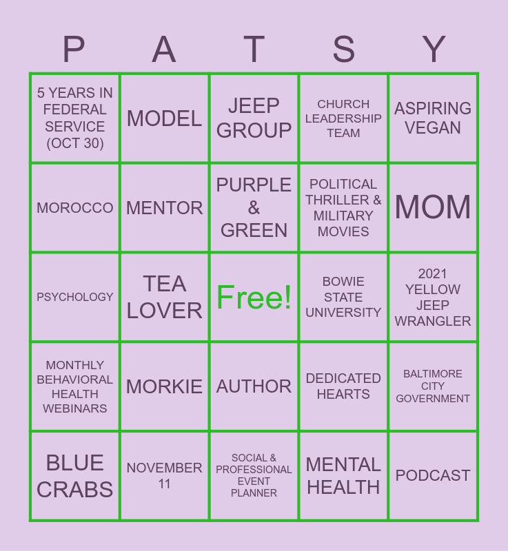This bingo card has a free space and 24 words: BLUE CRABS, MORKIE, PURPLE & GREEN, MENTAL HEALTH, ASPIRING VEGAN, 5 YEARS IN FEDERAL SERVICE (OCT 30), MODEL, JEEP GROUP, BOWIE STATE UNIVERSITY, 2021 YELLOW JEEP WRANGLER, PSYCHOLOGY, MENTOR, DEDICATED HEARTS, BALTIMORE CITY GOVERNMENT, MOROCCO, NOVEMBER 11, SOCIAL & PROFESSIONAL EVENT PLANNER, CHURCH LEADERSHIP TEAM, MOM, MONTHLY BEHAVIORAL HEALTH WEBINARS, TEA LOVER, AUTHOR, POLITICAL THRILLER & MILITARY MOVIES and PODCAST.