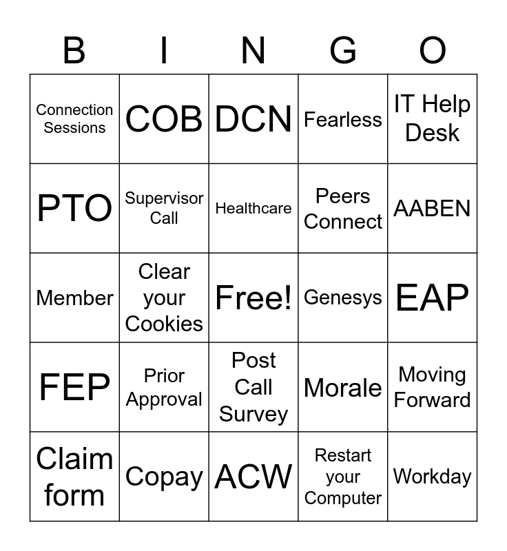 This bingo card has a free space and 51 words: CSP, Workday, Yammer, ACW, Prior Approval, Prop Points, COB, Voicemail, PTO, AEP, Supervisor Call, Fearless, Moving Forward, Morale, Blue Cross Blue Shield, Coffee, Healthcare, Genesys, Power, IT Help Desk, Clear your Cookies, Restart your Computer, Connection Sessions, Peers Connect, PLT, CSSAB, AABEN, Benefit Booklet, Claim form, DCN, Outlook, Teams, Zoom, Deductible, Coinsurance, Copay, Out-of-Pocket, ID card, Medical Records, Self Care, EAP, FEP, State Health Plan, Student Blue, SMA, Provider, Member, Medicare, Worker's Comp, Post Call Survey and Education.