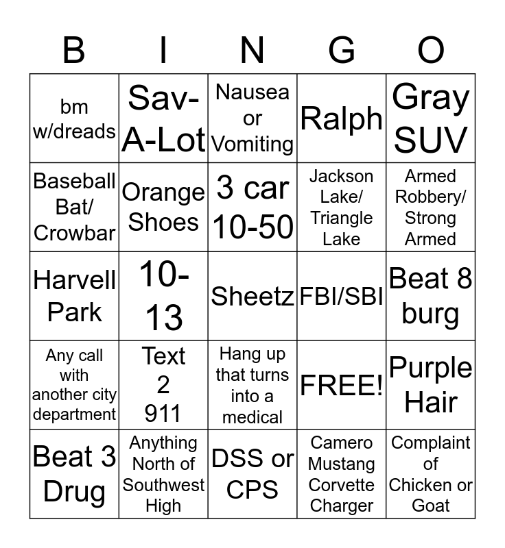 This bingo card has 25 words: Text 2 911, DSS or CPS, 3 car 10-50, Beat 3 Drug, Gray SUV, bm w/dreads, Baseball Bat/ Crowbar, Sav-A-Lot, FBI/SBI, Hang up that turns into a medical, Jackson Lake/ Triangle Lake, Harvell Park, FREE!, Purple Hair, Orange Shoes, Complaint of Chicken or Goat, Beat 8 burg, Nausea or Vomiting, Armed Robbery/ Strong Armed, 10-13, Sheetz, Anything North of Southwest High, Any call with another city department, Ralph and Camero Mustang Corvette Charger.