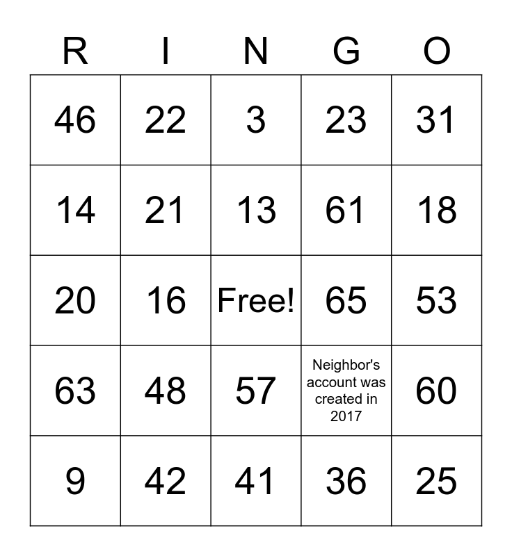 This bingo card has a free space and 74 words: 1, 2, 3, 4, 5, 6, 7, 8, 9, 10, 11, 12, 13, 14, 15, 16, 17, 18, 19, 20, 21, 22, 23, 24, 25, 26, 27, 28, 29, 30, 31, 32, 33, 34, 35, 36, 37, 38, 39, 40, 41, 42, 43, 44, 45, 46, 47, 48, 49, 50, 51, 52, 53, 54, 55, 56, 57, 58, 59, 60, 61, 62, 63, 64, 65, @aol.com email, New Neighbor(Set up in the last month), Neighbor's account was created in 2018, Neighbor's account was created in 2017, Has a Mesh Network, Bought their device at Costco, Has Interesting Device Names (Ex. Not Front Door), Has a Robin Tag and Uses a 5g network.