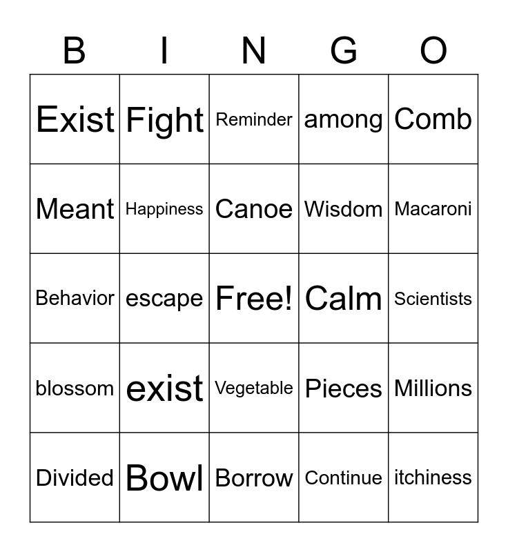 This bingo card has a free space and 29 words: Divided, community, escape, Calendar, Exist, Reminder, Happiness, exist, Calm, Bowl, Scientists, itchiness, Borrow, Continue, Macaroni, California, Vegetable, blossom, Comb, Behavior, Pieces, Pesticides, Wisdom, Meant, among, Fight, Millions, Canoe and Island.