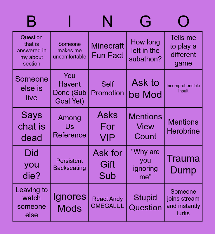 This bingo card has a free space and 24 words: Persistent Backseating, Ignores Mods, Self Promotion, Leaving to watch someone else, Tells me to play a different game, Question that is answered in my about section, Someone else is live, Someone makes me uncomfortable, Mentions View Count, Ask for Gift Sub, Ask to be Mod, Says chat is dead, "Why are you ignoring me", Trauma Dump, You Havent Done (Sub Goal Yet), Stupid Question, Mentions Herobrine, Minecraft Fun Fact, Incomprehensible Insult, Among Us Reference, Someone joins stream and instantly lurks, Did you die?, How long left in the subathon? and React Andy OMEGALUL.