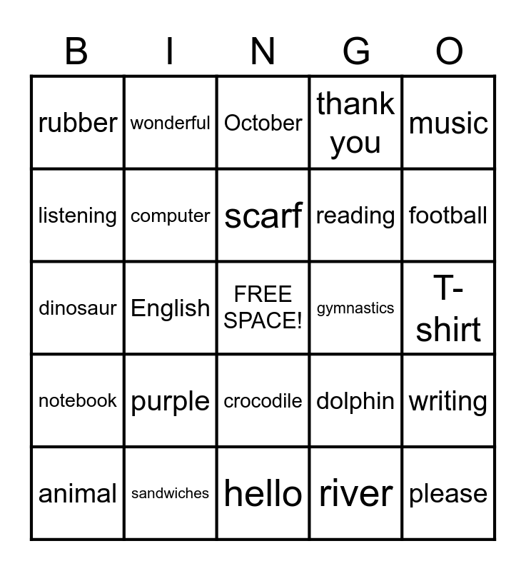 This bingo card has a free space and 33 words: school, autumn, English, pencil, notebook, computer, music, animal, wonderful, yellow, scarf, October, teacher, student, gymnastics, football, sandwiches, dinosaur, purple, dolphin, crocodile, table, rubber, T-shirt, hello, please, thank you, reading, listening, writing, mountain, river and tiger.