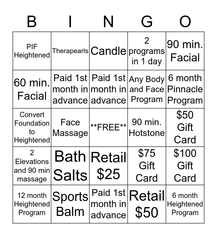 This bingo card has a free space and 24 words: Bath Salts, Sports Balm, Paid 1st month in advance, 12 month Heightened Program, 90 min. Facial, PIF Heightened, 60 min. Facial, Therapearls, 90 min. Hotstone, Retail $25, Any Body and Face Program, Convert Foundation to Heightened, $75 Gift Card, $100 Gift Card, Paid 1st month in advance, Retail $50, $50 Gift Card, Candle, 6 month Pinnacle Program, Face Massage, 6 month Heightened Program, 2 Elevations and 90 min massage, 2 programs in 1 day and Paid 1st month in advance.