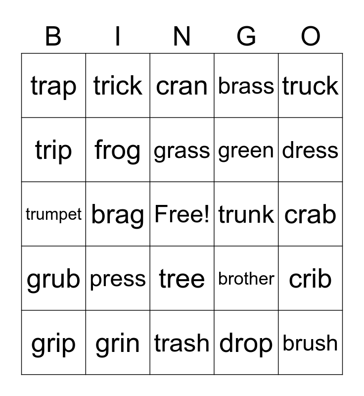 This bingo card has a free space and 24 words: press, grin, grass, grip, truck, trap, trip, trick, trunk, tree, green, trumpet, brother, crib, frog, drop, crab, cran, dress, brag, brush, grub, brass and trash.