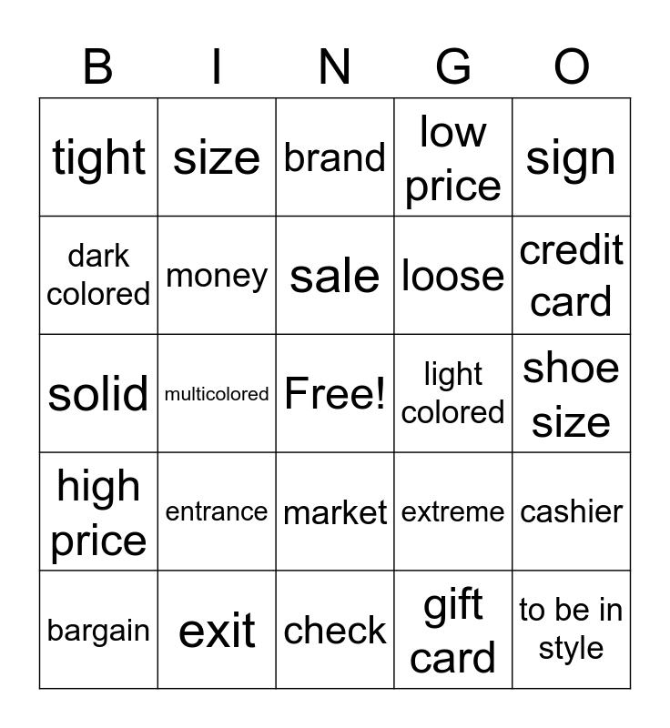 This bingo card has a free space and 24 words: entrance, exit, sale, bargain, sign, tight, dark colored, size, light colored, market, loose, solid, extreme, cashier, money, gift card, shoe size, brand, credit card, multicolored, to be in style, high price, low price and check.