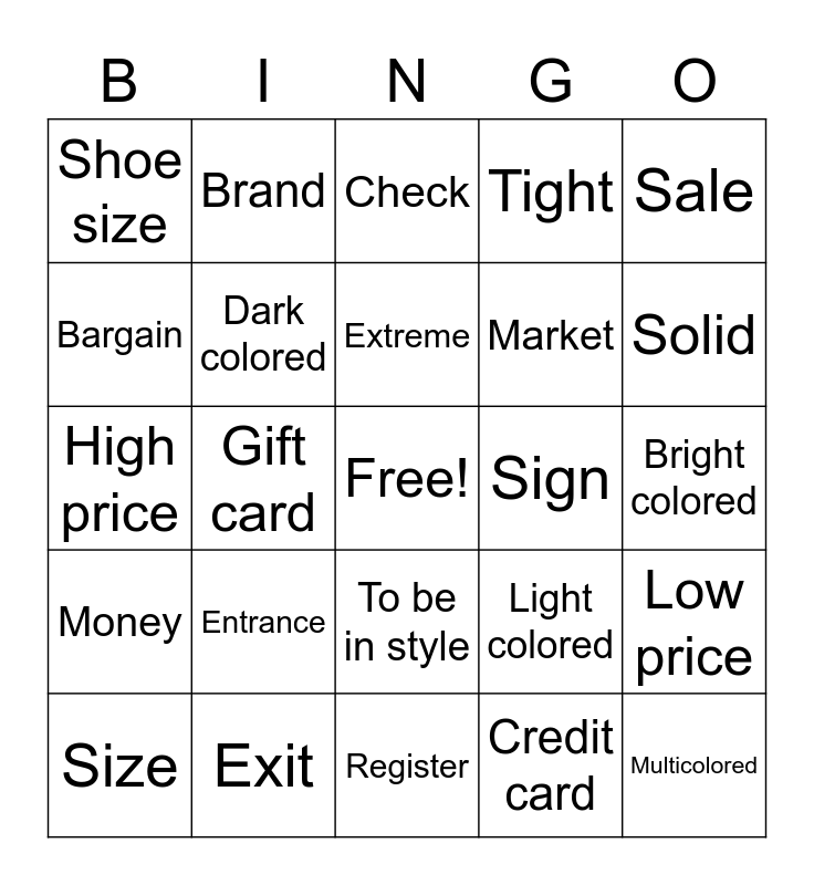 This bingo card has a free space and 24 words: Entrance, Exit, Extreme, Size, Sale, Shoe size, Bargain, Brand, Sign, To be in style, Market, High price, Light colored, Low price, Dark colored, Credit card, Bright colored, Check, Solid, Gift card, Multicolored, Money, Tight and Register.
